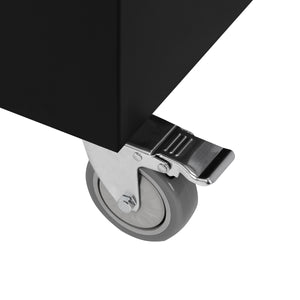 Fyra lätta plasthjul - varav ett par har ett låssystem - ger bekväm styrning och stabilitet vid placering av möbeln. Sidohandtaget gör det enkelt att manövrera rullvagnen runt i studion.